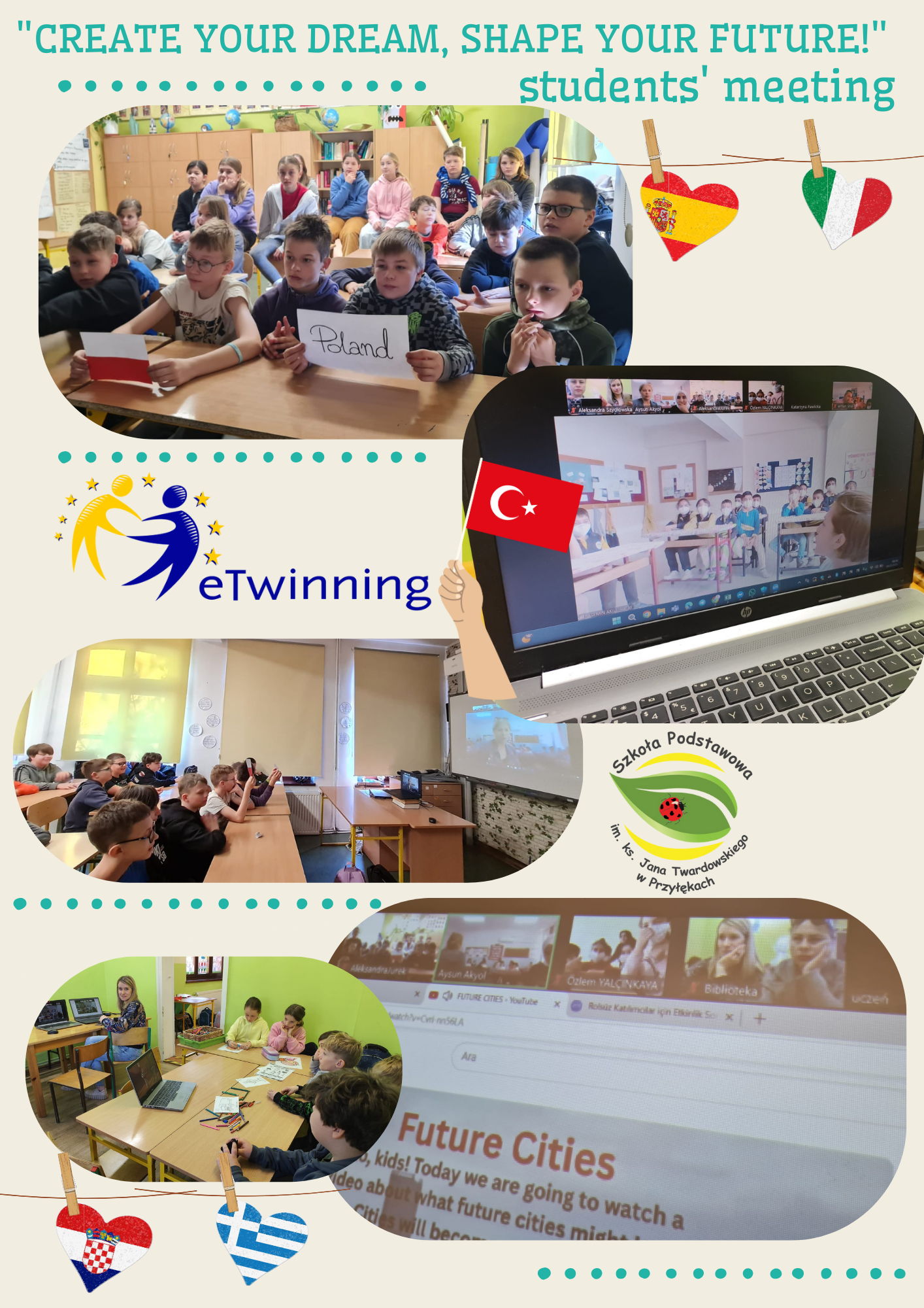 Dziś odbyło się nasze pierwsze międzynarodowe spotkanie online w ramach projektu eTwinning pt. “Create Your Dream, Shape Your Future!”. Współzałożycielką tego projektu jest nasza nauczycielka języka angielskiego – Aleksandra Jurek, która z pasją i zaangażowaniem włączyła do projektu Katarzynę Pawlicką oraz Aleksandrę Szydłowską, aby wspólnie odkrywać możliwości, jakie niesie ze sobą platforma eTwinning.