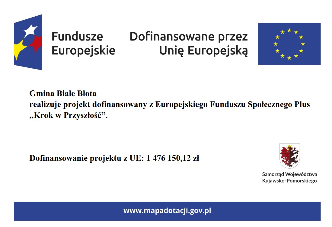 INFORMACJA O PROJEKCIE Gmina Białe Błota realizuje projekt dofinansowany z Europejskiego Funduszu Społecznego Plus „ Krok w przyszłość” . Celem projektu jest zapewnienie równego dostępu do dobrej jakości edukacji na terenie gminy Białe Błota. Działania w ramach projektu będą polegały na udzieleniu wsparcia uczniom i nauczycielom ze szkół podstawowych gminy Białe Błota tj. Szkoły Podstawowej …
