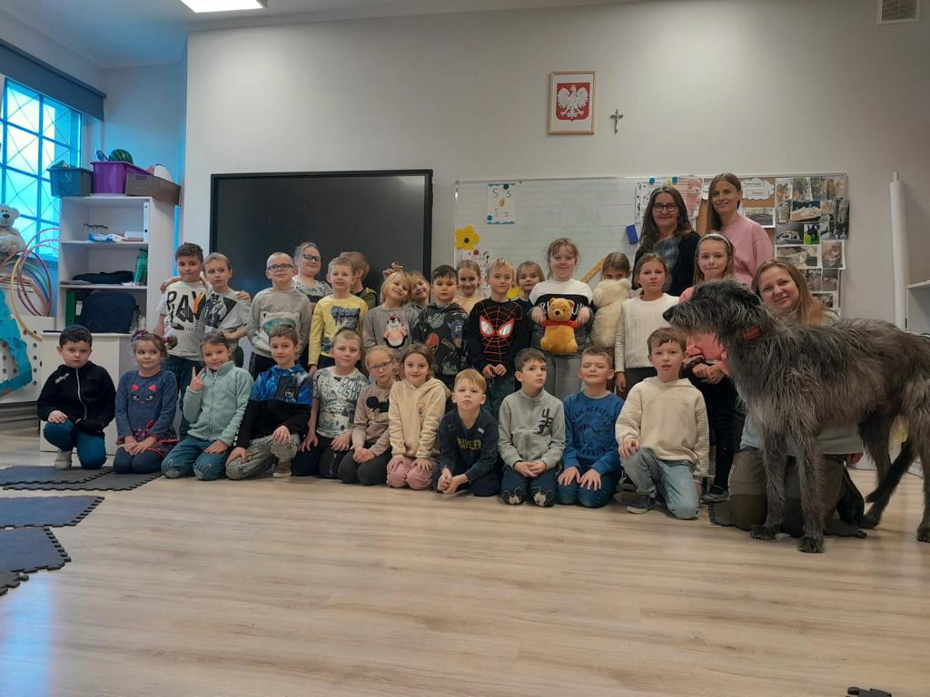 W piątek 24 listopada klasy pierwsze uczestniczyły w zajęciach z psem. Podczas tej wyjątkowej lekcji poznały Eltona, charta szkockiego i jego opiekunkę panią Lidię Piątek – nauczycielkę języka angielskiego i specjalistkę z zakresu kynoedukacji.