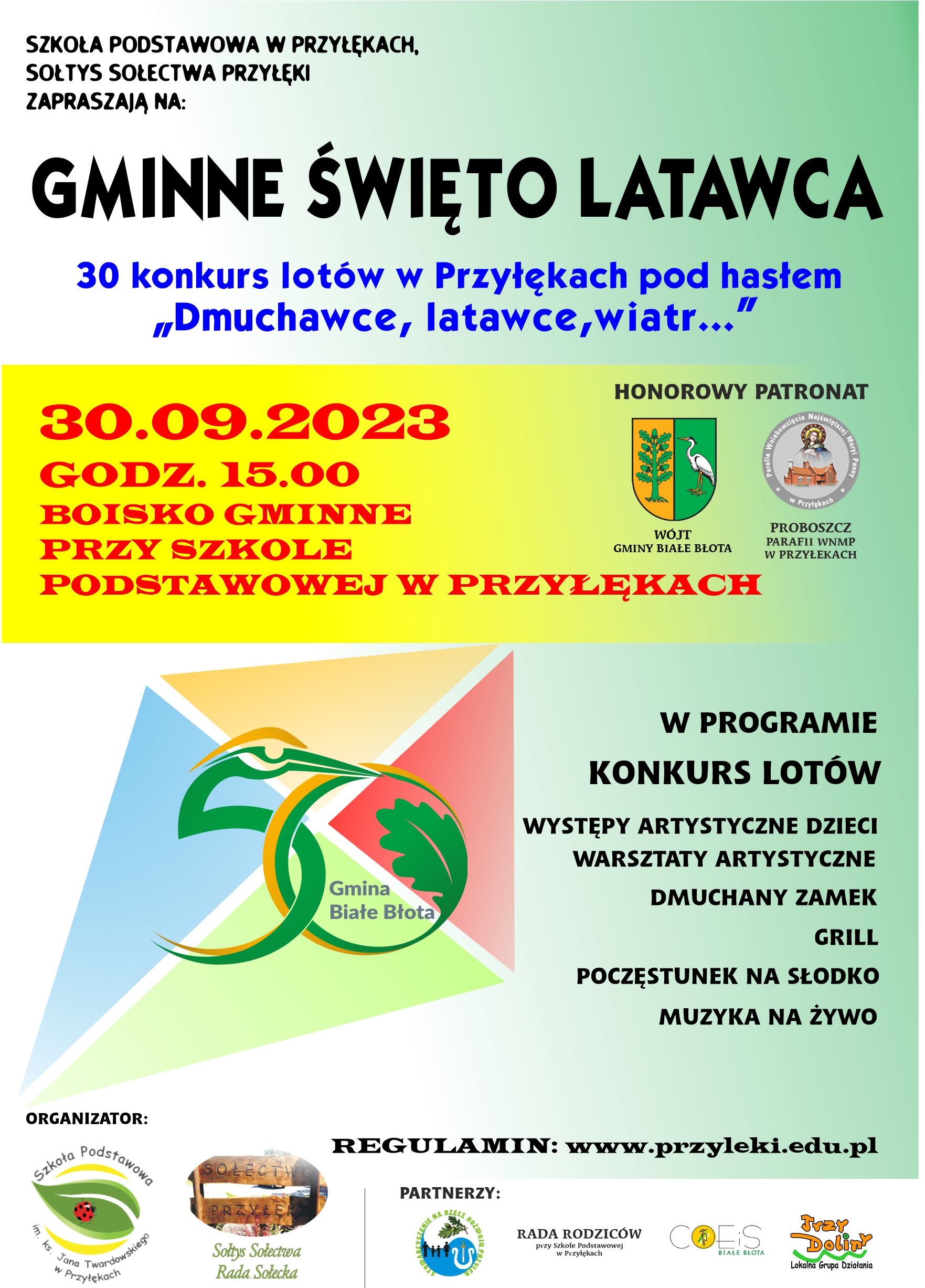 REGULAMIN 30 KONKURSU LOTÓW W RAMACH GMINNEGO ŚWIĘTA LATAWCA PRZYŁĘKI 2023 „Dmuchawce, latawce, wiatr…” Szkoła Podstawowa im. ks. Jana Twardowskiego w Przyłękach serdecznie zaprasza uczniów Szkół Podstawowych z terenu Gminy Białe Błota do udziału w GMINNYM ŚWIĘCIE LATAWCA, które odbędzie się 30 września 2023 r. o godz. 15.00na boisku gminnym przy Szkole Podstawowej w Przyłękach. • Wspólne świętowanie …