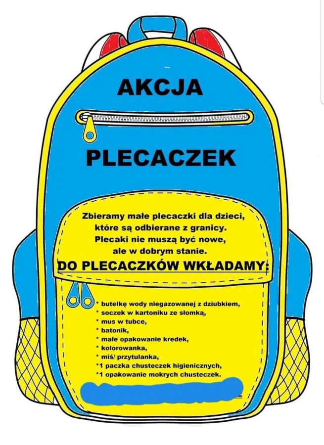 Drodzy Państwo, drodzy Uczniowie! Zbieramy małe plecaczki dla dzieci, które są odbierane z granicy. Plecaczki nie muszą być nowe, ale w dobrym stanie. Do plecaczków wkładamy: butelkę wody niegazowanej z dziubkiem, soczek w kartoniku ze słomką, mus w butelce, batonik, małe opakowanie kredek, kolorowankę, miś / przytulanka, 1 op. chusteczek higienicznych, 1 op. mokrych chusteczek. …