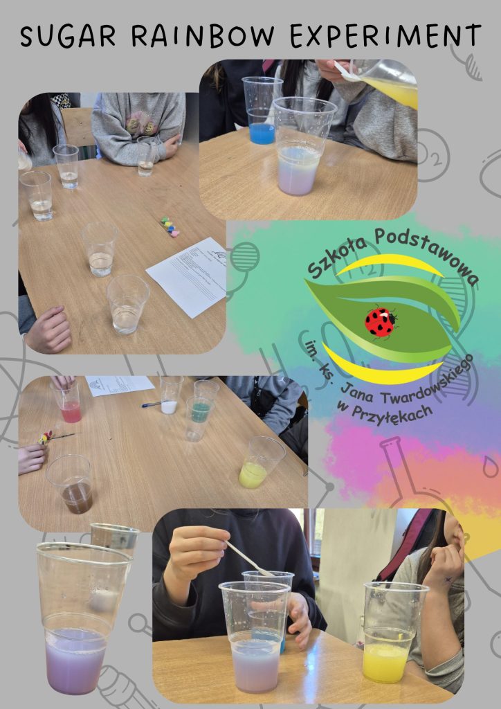 Nieco trudniejsze okazało się stworzenie tęczy z cieczy o różnej gęstości. Eksperyment wymagał precyzji i cierpliwości. Niestety płyny były nalewane zbyt szybko, przez co kolory wymieszały się i tęcza nie wyszła tak wyraźnie, jak planowano. Mimo to uczniowie mieli okazję przeanalizować przyczyny niepowodzenia i wyciągnąć wnioski na przyszłość, co jest ważnym elementem nauki przez doświadczenie.